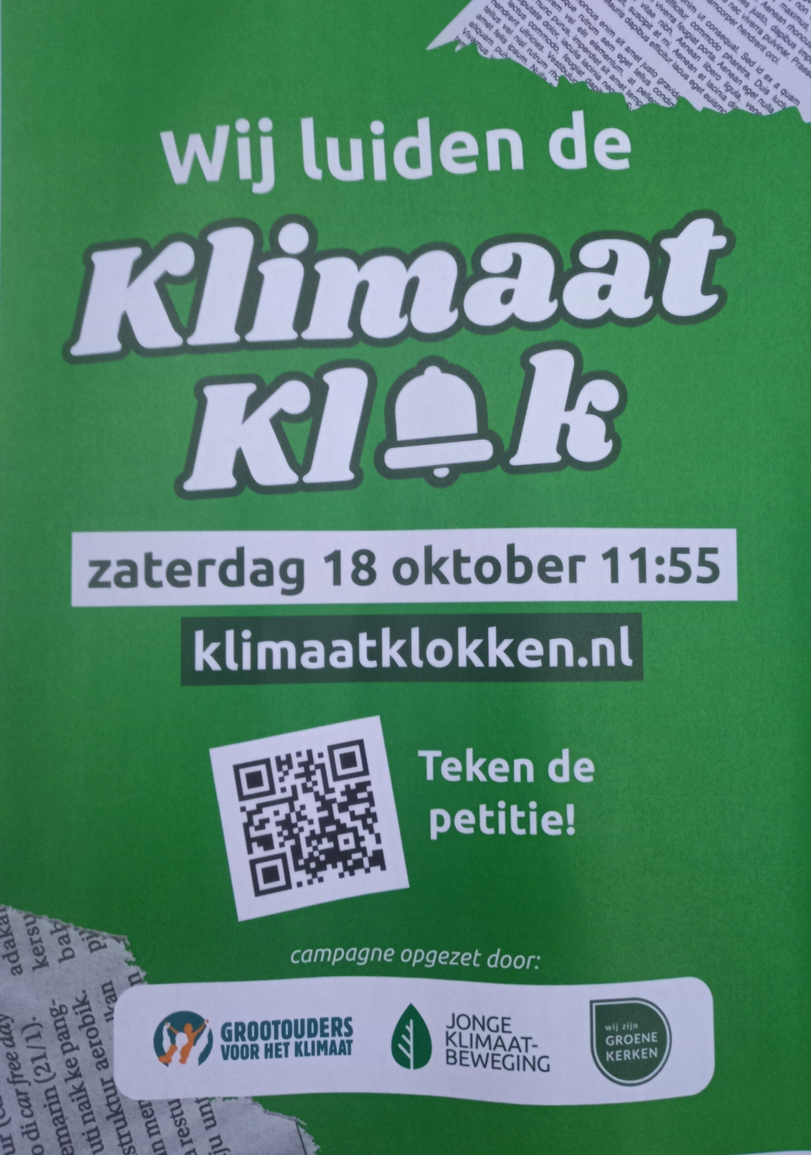 Het is vijf voor twaalf voor het klimaat! In de campagnes van veel politieke partijen is dit op de achtergrond geraakt en dat baart ons zorgen. Onze parochie is aangesloten bij het landelijk netwerk van Groene Kerken. Samen met De Jonge Klimaatbeweging en Grootouders voor het Klimaat roepen zij op de klokken te luiden voor het klimaat, en wel aanstaande zaterdag 18 oktober van 11.55 uur tot 12.00 uur.