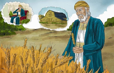 In die tijd zei iemand uit het volk tegen Jezus: “Meester, zeg aan mijn broer dat hij de erfenis met mij deelt." Maar Jezus antwoordde hem: “Man, wie heeft Mij tot rechter of verdeler over u aangesteld?" En Hij sprak tot hem: “Pas op en wacht u voor alle hebzucht! “Want geen enkel bezit, - al is dit nog zo overvloedig - kan uw leven veilig stellen." Hij vertelde hun de volgende gelijkenis: “Het land van een rijk man had een grote oogst opgeleverd. Daarom overlegde deze bij zichzelf: Wat moet ik doen? Ik heb geen ruimte om mijn oogst te bergen. En hij zei: Dit ga ik doen: ik breek mijn schuren af en bouw grotere: daarin zal ik dan heel mijn rijkdom aan koren opbergen. Dan zal ik tot mijzelf zeggen: Man, je hebt een grote rijkdom liggen, voor lange jaren; rust nu uit, eet en drink en geniet ervan! “Maar God sprak tot hem: Dwaas! Nog deze nacht komt men je leven van je opeisen; en al die voorzieningen die je getroffen hebt, voor wie zijn die dan ? Zo gaat het met iemand die schatten vergaart voor zichzelf, maar niet rijk is bij God."