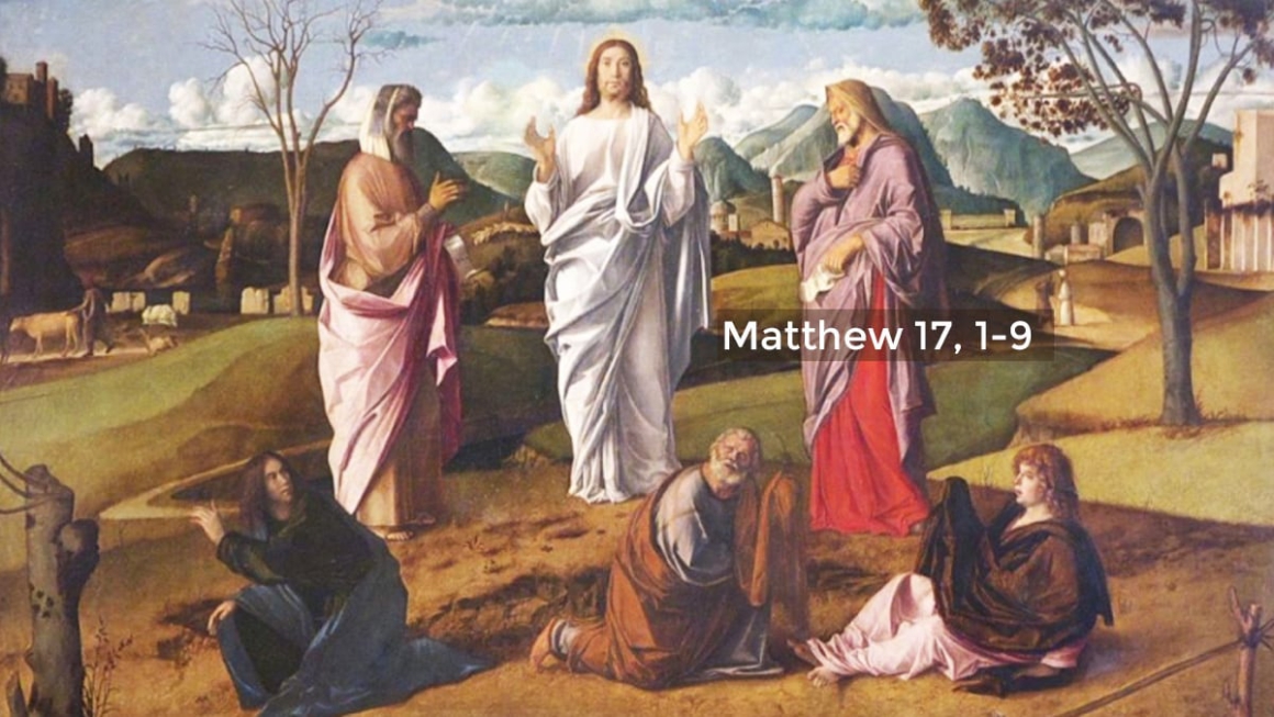 In die tijd nam Jezus Petrus, Jakobus en diens broer Johannes met zich mee en bracht hen boven op een hoge berg, waar zij alleen waren. Hij werd voor hun ogen van gedaante veranderd: zijn gelaat begon te stralen als de zon en zijn kleed werd glanzend als het licht. Opeens verschenen hun Mozes en Elia, die zich met Hem onderhielden. Petrus nam het woord en zei tot Jezus: "Heer, het is goed dat wij hier zijn. Als Gij wilt zal ik hier drie tenten opslaan, een voor U, een voor Mozes en een voor Elia." Nog had hij niet uitgesproken of een lichtende wolk overschaduwde hen en uit de wolk klonk een stem: "Dit is mijn Zoon, de Welbeminde, in wie Ik mijn welbehagen heb gesteld; luistert naar Hem." Op het horen daarvan wierpen de leerlingen zich ter aarde neer, aangegrepen door een hevige vrees. Maar Jezus kwam naar hen toe, raakte hen aan en zei: "Staat op, en weest niet bang." Toen zij hun ogen opsloegen zagen zij niemand meer dan alleen Jezus. Onder het afdalen van de berg gelastte Jezus hun: "Spreekt met niemand over wat ge hebt aanschouwd voordat de Mensenzoon uit de doden is opgestaan."